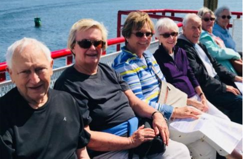 Our August morning began with pouring rain and 32 anxious passengers crowded under the awning and entryway to the Mead building eagerly awaiting the arrival of our Luxury Motor coach. Staff escorted passengers to the bus, juggling gigantic RiverMead golf umbrellas. The rain didn't stifle the excitement as passengers found their seats.